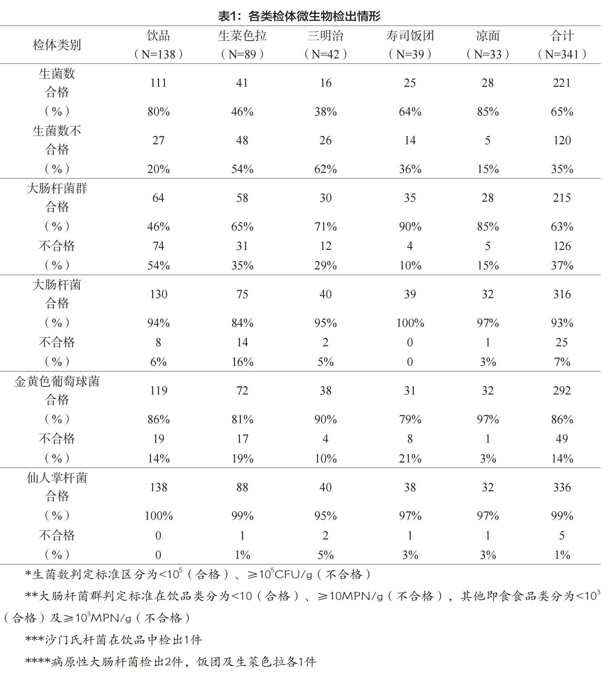 随着社会快速发展,人们的饮食方式也随之改变,为满足人们对于“迅速”与“食品多样”的要求,各种熟食及饮品等即食食品越来越多。然而这些即食食品在生产过程中若不注意卫生就很有可能被微生物污染,导致食品中毒事件的发生。本文为了解即食食品的卫生质量与食用安全性,在A地区的超市、便利商店、快餐店进行采样,检验项目涵盖食品中微生物及病原性微生物,包括生菌数、大肠杆菌群、大肠杆菌、金黄色葡萄球菌、仙人掌杆菌、沙门