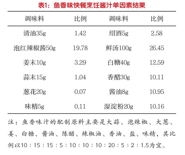 鱼香味是最能代表川菜的一种味型,广泛存在于四川及其周边地区,并以味美、清香、爽口而成为公众喜爱的菜系。鱼香味菜肴以泡辣椒、姜葱蒜为主调料,在烹调中能够产生一种特殊的鱼香口感,在方便米饭中的开发应用价值较为突出,但是鱼香味型复杂,工业化、大批量生产很难完美体现鱼香味。基于此,本文开发出一种鱼香味快餐烹饪酱汁制备方法,通过单因素实验和正交设计试验,确定鱼香味复合调味酱原材料的种类和用量,并对各正交设计