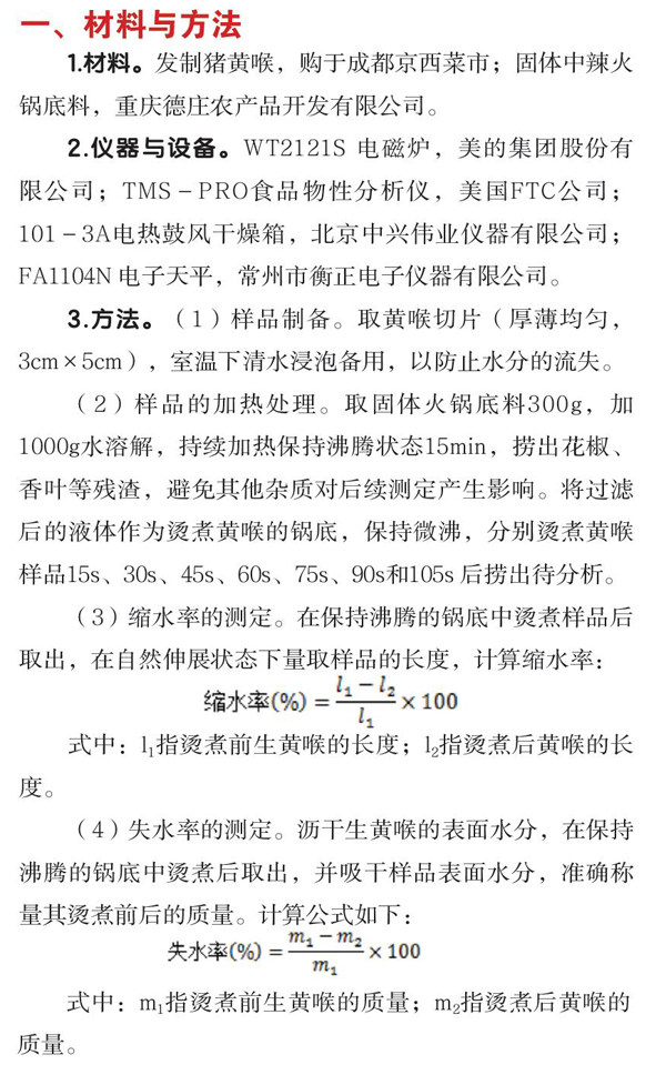 黄喉,猪、牛的屠宰副产物之一,脆嫩爽口,富含血红素和促进铁吸收的半胱氨酸,可改善缺铁性贫血、提高机体免疫力、增强抵抗力,且高蛋白、低脂肪,相对于其他内脏部位的营养价值略高。作为一种肉制品,黄喉最主要的食用方式是在火锅中涮烫。 黄喉和其他肉制品相同,经烫煮加热后会发生汁液流失、蛋白质的变性,以及质构特性的改变等,若烫煮过度,黄喉将会丧失“脆嫩化渣”的口感。通过研究不同烫煮时间对黄喉食用品质的影响,