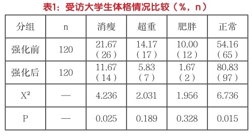 大学生的营养状态是当前社会和教育领域关注的重点问题,良好的体魄是人才培养的重要组成部分,而良好的营养状态是塑造健康体魄的基础,因而需探明大学生营养状态,并积极采取改善措施。本校基于学生及学校实际情况,制定了强化食品营养与膳食搭配措施,并选择2019级大学生120例作为研究对象,对比分析了其实施效果,现总结如下。 一、资料与方法 1.一般资料。本校于2020年9月开始落实强化食品营养与膳食搭配措