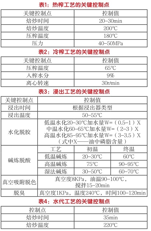 本文结合食用油的生产关键点,列举常见的质量安全问题,并指出了食用油的潜在风险点。 一、食用油的生产工艺及关键控制点 国内传统的食用油加工工艺主要包括四种:冷榨工艺、热榨工艺、浸出工艺以及水代工艺。此外,新型的制油工艺还包括:超临界CO2萃取工艺、亚临界萃取工艺及水酶法工艺。其中,热榨工艺、冷榨工艺、浸出工艺、水代工艺的关键控制点分别如表1、2、3、4所示。 二、食用油产品存在的质量安