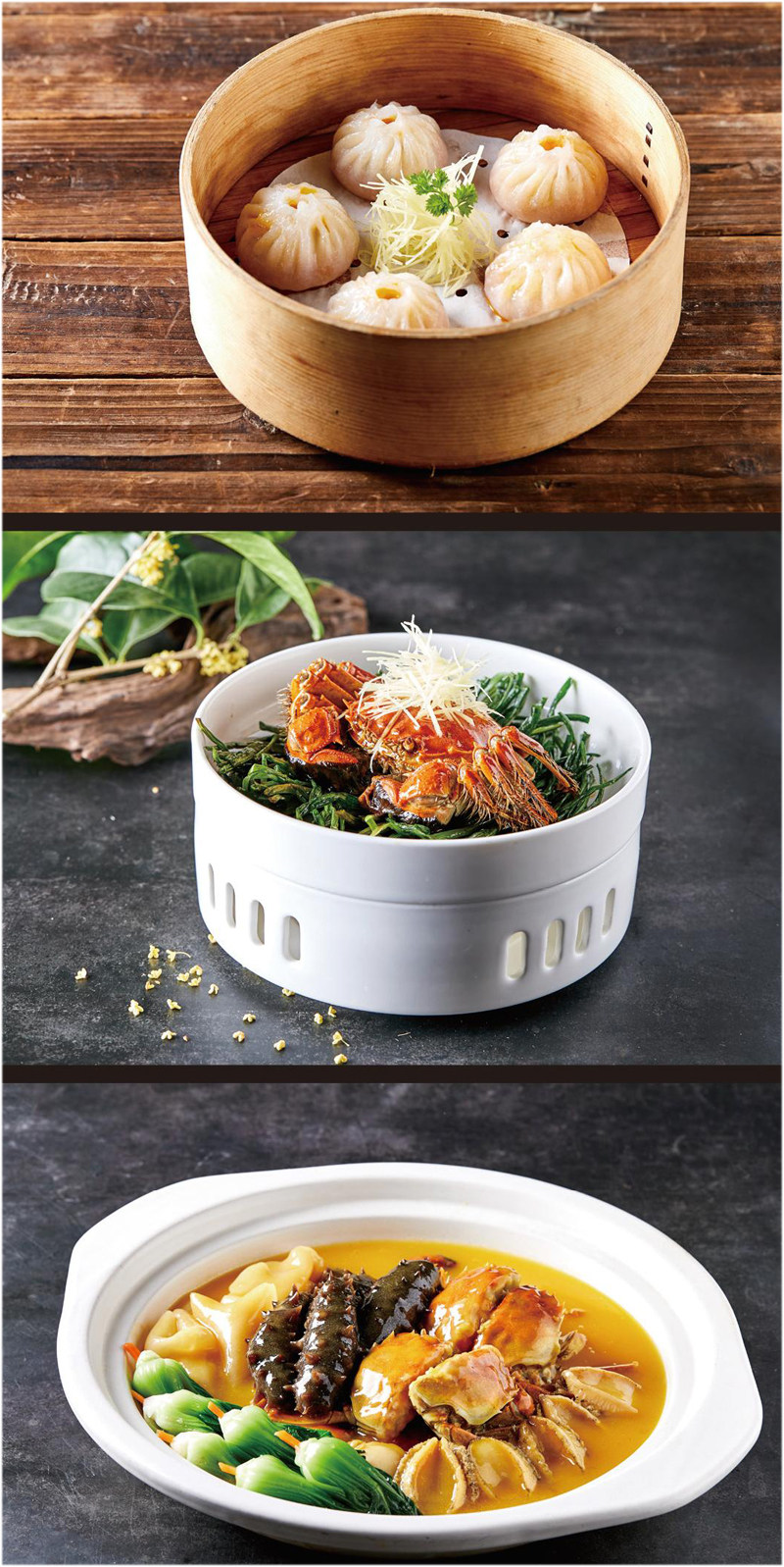 水晶蟹黄包 这是江苏的一道传统小吃,属于苏浙菜。水晶蟹黄包的制作原料十分讲究,馅为蟹黄和蟹肉,汤为原味鸡汤,制作工艺精妙绝伦,蟹黄汤包在明清时期已经享有盛誉,其特色是皮薄如纸,吹弹即破,制作“绝”、形态“美”、吃法“奇”。 葱焗大闸蟹 蟹壳红艳松脆,若即若离。八珍玉食,蟹黄饱满,入口醇香,蟹肉鲜嫩,略带甜酸,风味独特,在口腔中擦出惊喜的火花。 金汤蟹皇佛跳墙 秋天收获之际,是品尝大闸蟹的
