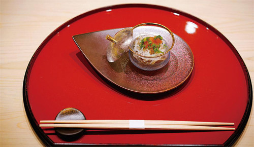 河鲀料理是日本三大美食料理之一,进入冬季开始,河鲀肥大,肉质鲜美,口感劲道,是品尝河鲀的好季节。日本的河鲀宴是把一条河鲀鱼加工成多道菜品,其中主要包括鱼鳍酒、凉拌河鲀皮、生河鲀鱼片、烤豚白、炸河鲀、河鲀火锅等。只有10月至次年4月,鮨原箸才会供应河鲀料理,需提前1天预订。鮨原箸所使用的河鲀是海水养殖的红鳍东方鲀,经过餐厅主理人、主厨王勇的一番匠心打造,一整只河鲀被专业拆分,从头到尾、从皮到肉,食客