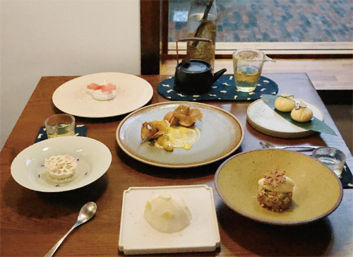 园冶 这是一道可赏可食的园林风甜品,红糖泡芙蘸着香甜的玉米卡仕达酱,层次感丰富,烤芝士奶香可口,每种口味都是一种惊喜 岫云 用莲藕做的慕斯口感轻盈,唇齿间萦绕着莲藕的清香;马蹄糯米糕浸在甘润的桂花莲藕羹中,眼前尽是江南水乡的味道。 福袋 透明的越南春卷皮中包起焦糖慕斯,里面藏着临安山核桃,抿入口中顺滑绵密。 霞蔚 制作时间历经10小时以上的蛋白壳包裹着山楂慕斯车厘子冻和岩茶奶油,将蛋