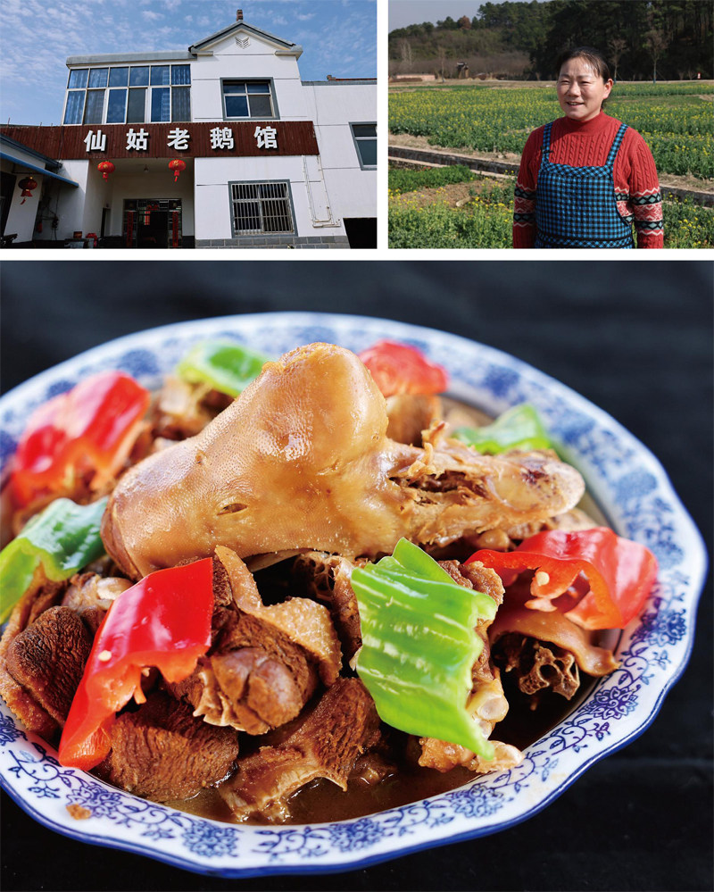 金坛茅山风景秀美,具有良好的生态和旅游环境。坐落在金坛茅山脚下的仙姑村已有20 余家农户自办农家乐,是家庭出游的好去处。这里炊烟袅袅,乡音亲切,生态优美,在这能感受到陶渊明笔下“久在樊笼里,复得返自然”的轻松闲适。游客来到仙姑村可以品尝到当地淳朴温馨、绿色健康的农家菜。仙姑老鹅馆在这片土地上已经开了近20 年,老板娘一手打理着小店,许多年来招牌菜一直都是红烧老鹅,老板娘将这一道菜做得炉火纯青,曾经