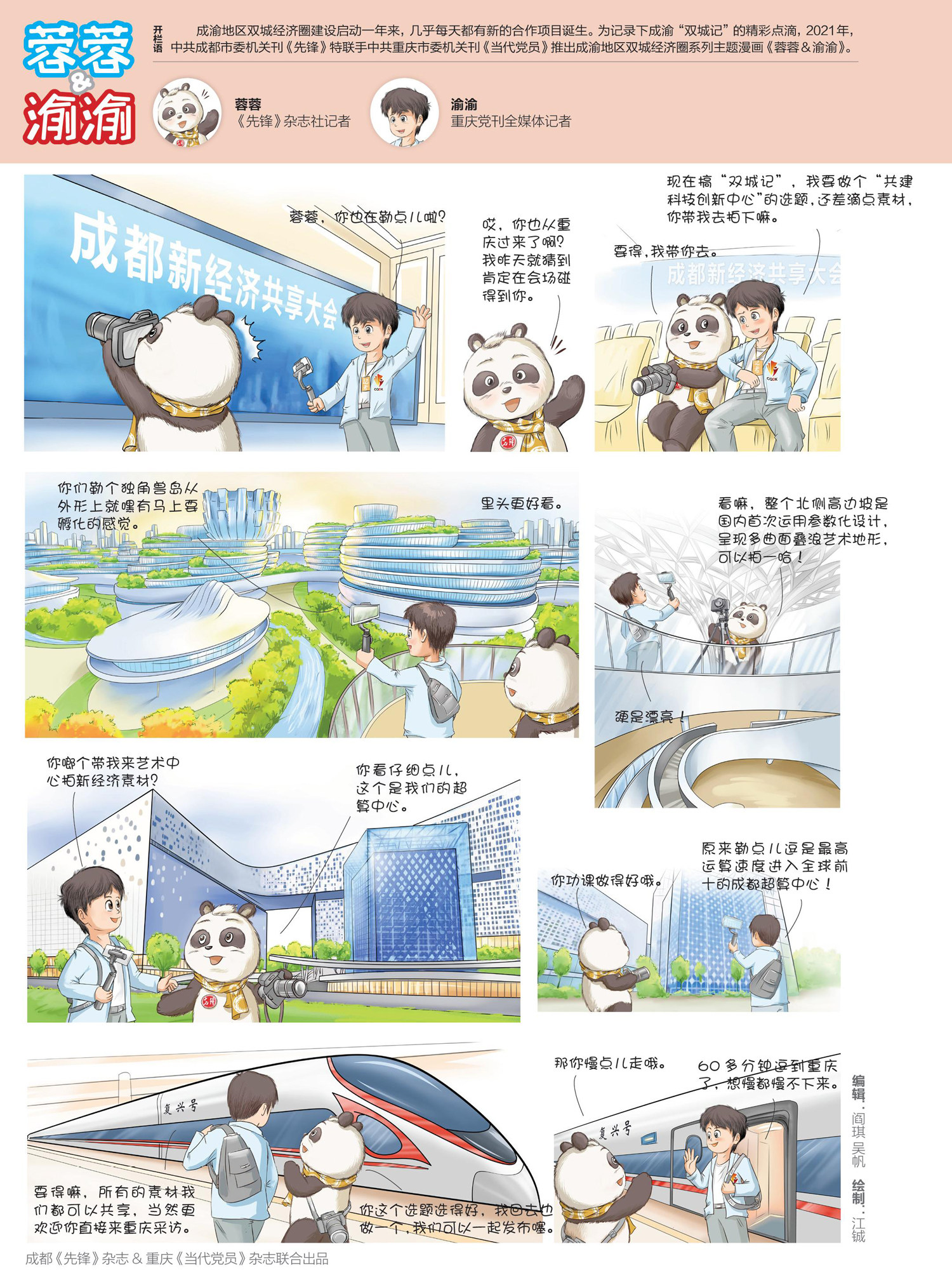 成渝地区双城经济圈建设启动一年来,几乎每天都有新的合作项目诞生。为记录下成渝“双城记”的精彩点滴,2021年,中共成都市委机关刊《先锋》特联手中共重庆市委机关刊《当代党员》推出成渝地区双城经济圈系列主题漫画《蓉蓉&渝渝》。