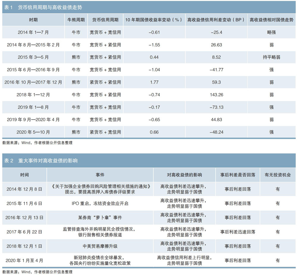 摘要:本文通过逐年分析高收益债走势,得出高收益债投资择时的三条重要结论:宽信用环境对于高收益债投资更加有利,紧信用环境下投资损失较大;在债券牛市阶段,重大事件的发生对高收益债的冲击是暂时的,而在债券熊市阶段,重大事件的发生对高收益债的冲击较为持久;从跨年效应来看,受制于银行信贷额度年初宽松、年底紧张的规律,年初投资高收益债的胜率更大。 关键词:高收益债 投资策略 货币政策 择时 高收益债