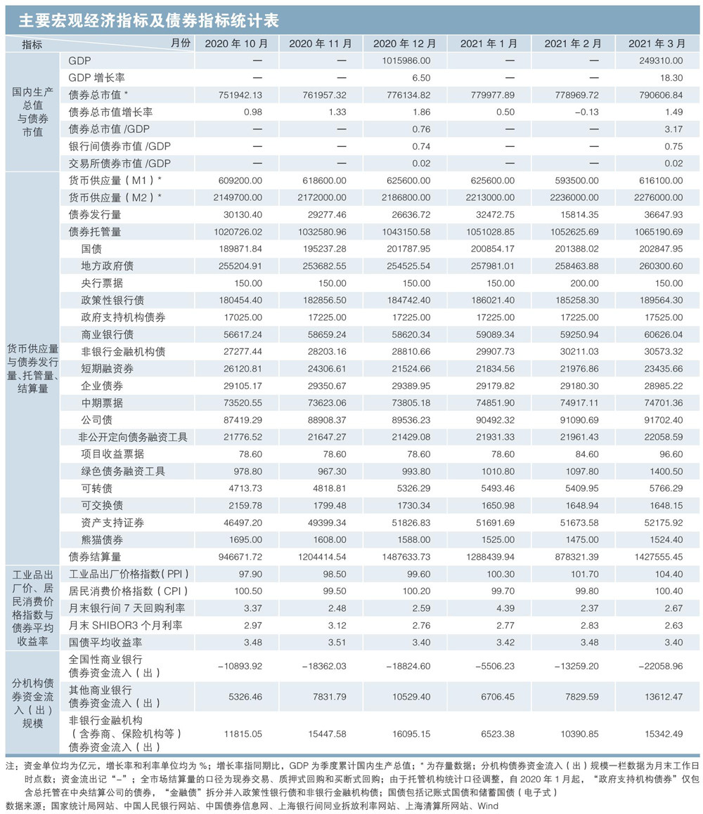 2021年3月,美国工业生产者出厂价格指数(PPI)、居民消费价格指数(CPI)大幅上涨,欧元区采购经理指数(PMI)仍在分化。国内宏观经济持续回升,CPI同比上涨0.4%,PPI同比上涨4.4%,制造业PMI景气回升。本月货币政策操作实现资金净回笼300亿元,资金利率有所下降。债券收益率整体下行,中债-新综合指数(净价)有所上升。债券市场发行量小幅增长,债券存量稳步扩大。 宏观经济情况 (一