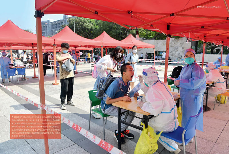 2021年9月1日,北京大学2021级新生进入邱德拔体育馆报到前,进行核酸检测。2021年,北京大学共录取4402名本科新生,其中校本部录取本科新生3003人,他们分别来自全国959所中学;同时录取了来自海外40个国家和地区的388名留学生,以及101名软件工程第二学士学位学生。医学部共录取本科新生865人,另录取了来自11个国家和地区的留学生45名。 (数据来源:新京报 图片来源:IC phot