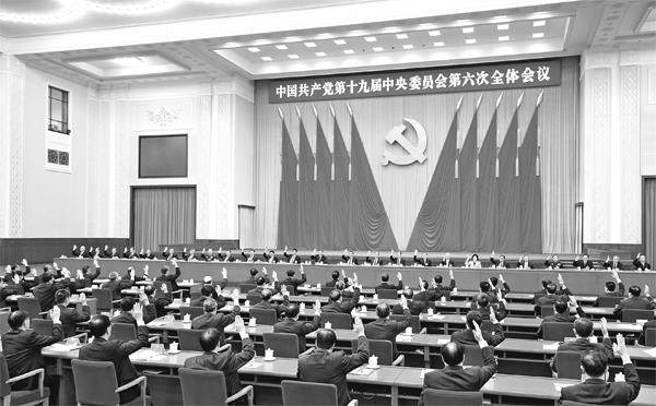 中国共产党第十九届中央委员会第六次全体会议,于2021年11月8日至11日在北京举行。中央政治局主持会议。燕雁/新华社 党的十九届六中全会审议通过《中共中央关于党的百年奋斗重大成就和历史经验的决议》,发出新时代中国共产党人牢记初心使命、坚持和发展中国特色社会主义的政治宣言。 决议中专列第七部分“新时代的中国共产党”,围绕实现第二个百年奋斗目标提出—— “现在,党团结带领中国人民又踏上了实现第