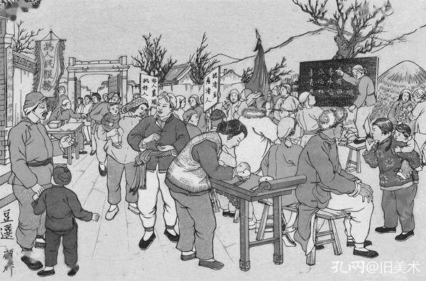 《豆选》年画。顾群 20世纪40年代,中国共产党在解放区竖起了民主、自由的大旗,通过选举成功地动员了农民,将农村治理权从地方士绅、地主的掌控中转移到农民手中。为了动员不识字的农民参与选举,共产党使用了很多有创意的办法,其中最为人所津津乐道的就是豆选。 1 豆选就是选举时用豆子当选票。它之所以能引起大家的好奇和关注,其主要原因在于这种方法让不识字的农民借用投豆来代替填写选票,以表达对候选人的看
