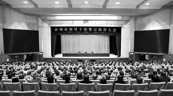2022年2月14日上午,湖南省永州市召开全市领导干部警示教育大会。新华社 “我给工作过的地方经济发展环境、政治生态造成重大损失,我深深地忏悔。” “走向违法犯罪的道路,这是咎由自取,我向组织、向人民深深地忏悔。” “人的一辈子路很长,如果迷失初心、失去底线,是保不得平安的……” 2022年2月14日上午,湖南省永州市召开全市领导干部警示教育大会,现场播放了专题警示教育片。该市2021年被