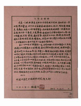 梅兰芳(1894—1961) 京剧表演艺术家,曾任中国戏曲研究院院长、中国京剧院院长。1957年12月向党组织递交入党志愿书,1959年3月加入中国共产党。 我是一个戏曲演员,在旧社会里是被压迫的,自幼受到一些旧思想的熏染,对于社会的发展规律缺乏认识,阶级觉悟很差,凭着自己的良心,我只能学习着人民的特别是戏曲界一些传统的美德,勉力作(编者注:做)一个善良、正直、勤劳、爱国的艺术劳动者而已。我一