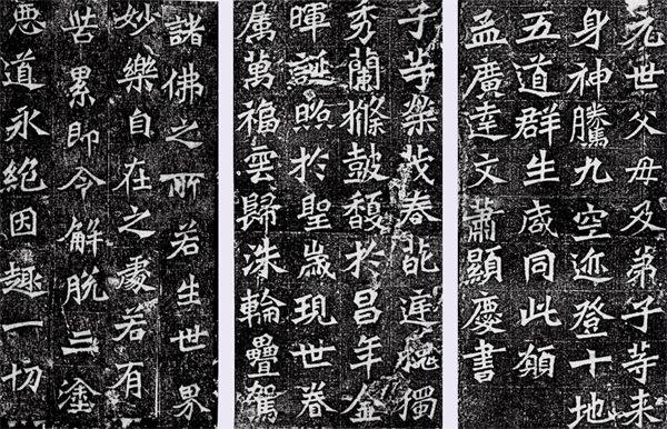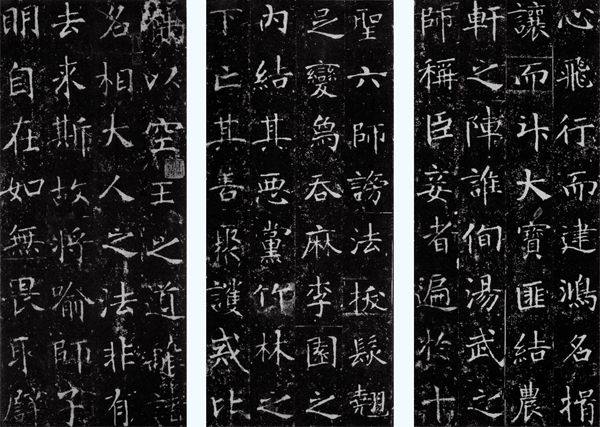 龙藏寺碑(拓本局部) 楷书 高171cm 宽90.5cm 隋 现存于河北正定隆兴寺此碑运笔沉挚,结构朴拙谨严,方整有致,遒劲端丽中尚留隶书遗韵,在南北朝至唐代书法史上处于承前启后的地位。 融合南北 随着隋朝一统天下,南北书风渐趋融合。虽然隋朝国祚甚短,但是其在书法史上仍起到了承前启后的作用。隋朝在短短30余年时间里,统一了南北朝末期形式固定而又略显杂乱、彼此相异而又趋于接近的书风,形成了骨架整