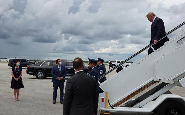 2020年9月8日,时任美国总统特朗普抵达佛罗里达州,佛州州长德桑蒂斯(左二)到机场迎接。 进入2022年中期选举周期,美国共和党人正在极力推动所谓的“文化战争”,如全面禁止堕胎,禁止公立学校在性别、性取向和种族议题上对学生进行所谓“灌输”,等等。佛罗里达州无疑走在这场“战争”的最前沿,其最重要的推手便是该州州长罗恩·德桑蒂斯(Ron DeSantis)。当前,德桑蒂斯在共和党内是仅次于特朗普的