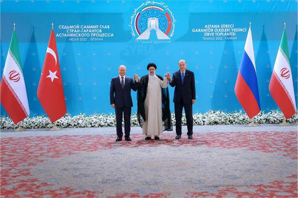 2022年7月19日,伊朗总统莱希(中)、俄罗斯总统普京、土耳其总统埃尔多安(右)在德黑兰举行“阿斯塔纳进程”首脑会议。 自俄乌冲突爆发以来,俄罗斯与美国在全球舞台上展开激烈博弈。由于地缘和能源因素,中东一直是俄美争夺的热点地区。7月13日至19日,美国总统拜登和俄罗斯总统普京前后脚出访这一地区,双方在中东的竞争意味甚浓。 俄美在中东“打擂台” 时下,俄美都使出浑身解数,争取中东国家支持,在