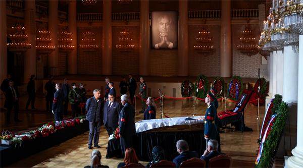 2022年9月3日,戈尔巴乔夫遗体告别仪式在莫斯科工会大厦举行。 2022年8月30日晚,苏联最后一任领导人米哈伊尔·戈尔巴乔夫因长期重病医治无效,在俄罗斯总统事务局中央临床医院去世,享年91岁。 9月1日,俄总统普京赴医院吊唁,向戈尔巴乔夫遗体告别。9月3日,戈尔巴乔夫遗体告别仪式在莫斯科工会大厦圆柱大厅举行。仪式后,戈尔巴乔夫被安葬在莫斯科新圣女公墓。普京因行程安排,未出席戈尔巴乔夫葬礼。