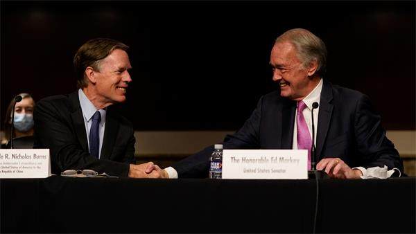 2021年10月20日,尼古拉斯·伯恩斯(左)出席美国参议院外交关系委员会举行的美国驻华大使提名听证会。图为在听证会上伯恩斯与参议员埃德·马基握手。 2021年12月16日,美国参议院以75票对18票的表决结果通过对尼古拉斯·伯恩斯担任美国驻华大使的提名案,这一空缺了近14个月的重要外交职位终于尘埃落定。拥有职业外交官和学者履历的伯恩斯,究竟是给中美关系带来一阵清风,还是再添一丝凉意? 经验丰
