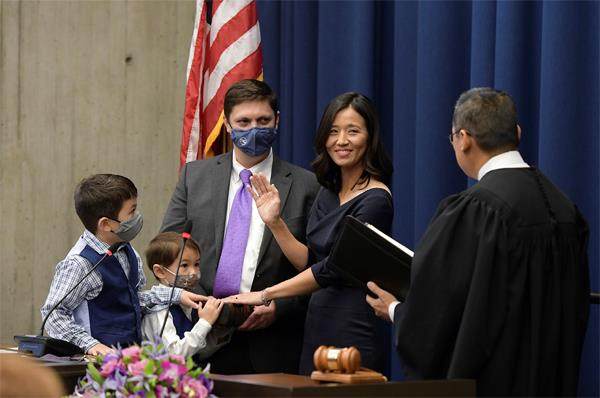2021年11月16日,吴弭在家人陪伴下宣誓就任美国波士顿市长。 2021年11月2日,36岁的华裔候选人吴弭(Michelle Wu)当选美国波士顿市长,成为该城200多年历史上首位亚裔女性市长,打破了波士顿市长选举中白人男性长期垄断的局面。吴弭的成功当选折射出当今美国社会方兴未艾的亚裔政治潮流。 近年美国亚裔参政热情大幅提升,全美当选官员的亚裔人士数量亦逐步上升。据“亚裔美国人委员会”统计
