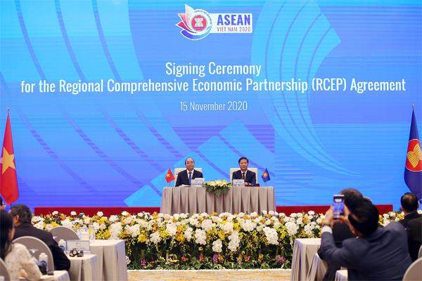2020年11月15日,东盟轮值主席国越南的时任总理阮春福(左)主持以视频形式举行的第四次RCEP领导人会议。15个国家正式签署RCEP,标志着全球规模最大的自由贸易协定正式达成。 当前,新冠疫情仍在全球肆意蔓延,许多国家和地区陷入失控状态,造成空前深重的生命危机、经济衰退和社会震荡,也强烈冲击和全面加速了世界变局,以致世界百年大变局的每一重要层面,无不镌刻出世纪疫灾留下的强烈印记。世界中心向东