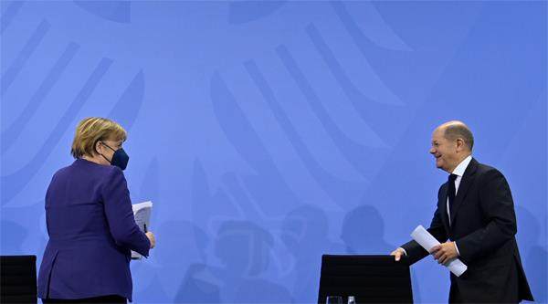 2021年12月2日,德国看守总理默克尔与副总理兼财政部长朔尔茨在柏林共同出席有关新冠疫苗接种的新闻发布会。 2021年12月8日,德国联邦议院就组建新一届联邦政府进行投票,社民党总理候选人、现任副总理兼财政部长朔尔茨正式成为新一届联邦政府总理。这意味着德国迎来16年来首次领导人权力交接,默克尔的总理生涯彻底结束。德国乃至整个欧洲正式进入“后默克尔时代”。 现年67岁的默克尔自2005年开始担