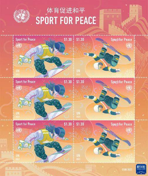 1月14日,联合国邮政管理局宣布,为庆祝2022年北京冬奥会的召开,联合国将发行主题为“体育促进和平”的邮票。这是联合国首次为冬奥会发行邮票。联合国邮政管理局说,这次发行的邮票面值分别为0.58美元、1.30美元、1.10瑞士法郎、2.00瑞士法郎、0.85欧元和1.80欧元,分别展现了冰球运动员、单板滑雪运动员、花样滑冰运动员、雪车运动员、冰壶运动员以及高山滑雪运动员形象。这些邮票由中国插画