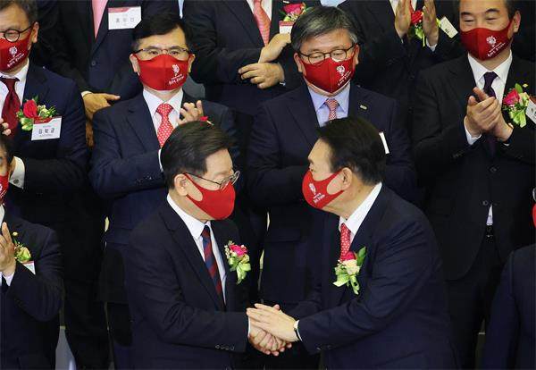 2022年1月3日,尹锡悦(前排右)与李在明在共同出席韩国交易所新年开市仪式时握手。 随着3月9日韩国第20届总统大选日期临近,选战已进入白热化阶段。执政党共同民主党候选人李在明与最大在野党国民力量党候选人尹锡悦,均被爆出黑料,两人支持率一度受到波及。国民之党候选人安哲秀趁势突起,支持率飙升至10%以上,打破李尹两强格局,成为影响“战局”的黑马。此次大选呈现出几个新特点:一是两大候选人深陷丑闻泥
