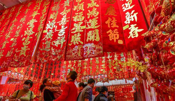 2022年1月15日, 海南省海口市博爱南路上,彩灯高挂,春联高悬,民众争相采买年货,喜迎虎年到来的气氛浓厚。 每逢新春,春联便成为中华大地上家家户户门前的“风景”。春联是我国人民迎接农历新年的一种重要习俗,要求对仗工整、文字凝练,抒发对美好生活的向往。大家耳熟能详的“天对地,雨对风,大陆对长空。雷隐隐,雾蒙蒙。山花对海树,赤日对苍穹”,便是春联的基本对仗规则之一。在与我们毗邻的朝鲜半岛,也有类