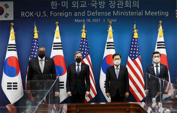 2021年3月18日,韩国外长郑义溶和防长徐旭,同美国国务卿布林肯和防长奥斯汀在首尔举行2+2会谈。 3月16日召开的美日2+2会谈议题“跑偏”,将矛头对准中国,直接强调中国“威胁”并明确表示将共同应对中国“挑战”,引起中方痛斥。而两天后即3月18日美韩2+2会谈后发表的声明却并未提及中国,与美日声明形成鲜明对比。 美韩2+2会谈主要内容 近年来,美国出于对华政策考虑来规划同盟政策的倾向越来