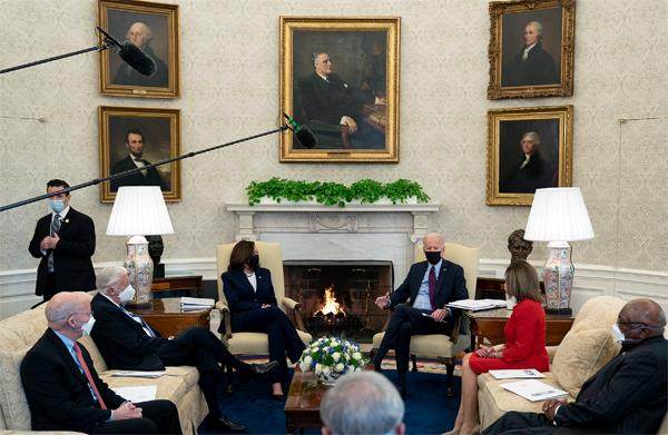 2021年2月5日,参议院批准了拜登总统的1.9万亿美元的刺激计划。图为计划在参议院批准后,拜登在白宫与众议院委员会相关人员开会。 2021年3月11日,美国总统拜登在白宫签署了1.9万亿美元的“美国救助计划”,主要内容包括:为每周失业救济金增加300美元额外福利,扩大失业救济范围并将适用时间延长至9月6日;为州和地方政府注入约3500亿美元资金;为学校重新开放提供约1700亿美元资金等。这是拜