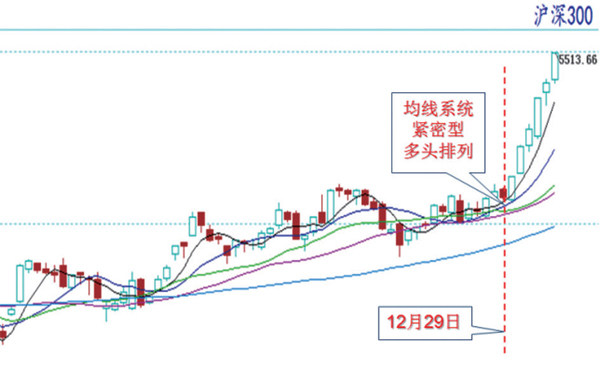 “行至水穷处,坐看云起时。”2020年的最后一天,A股大盘终于结束长达半年的多空纠缠局面,上证指数向上突破,出现了期待已久的量价齐升。 对于技术分析而言,关键是本次跨年行情能否提前预见?其实,如果足够细致,还是有一些迹象可循的,首先最直观地反映在大盘指数的均线、均价和K线形态等三个方面。 第一,指数均线。12月29日,沪深300指数均线出现难得一见的紧密型多头排列。(见图一) 图一:沪深30