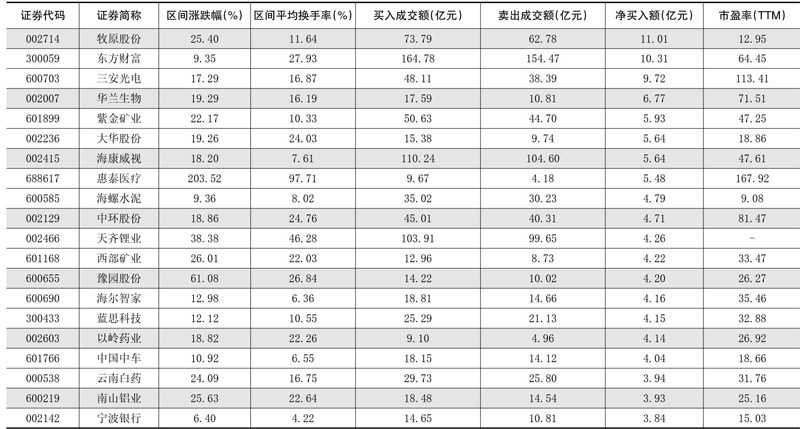 北向资金净流向图(2020年12月7日-2021年1月5日) 北向资金前20大活跃个股(2020年12月31日-2021年1月6日) 注:成交占比指区间内陆股通成交金额占总成交金额的比例