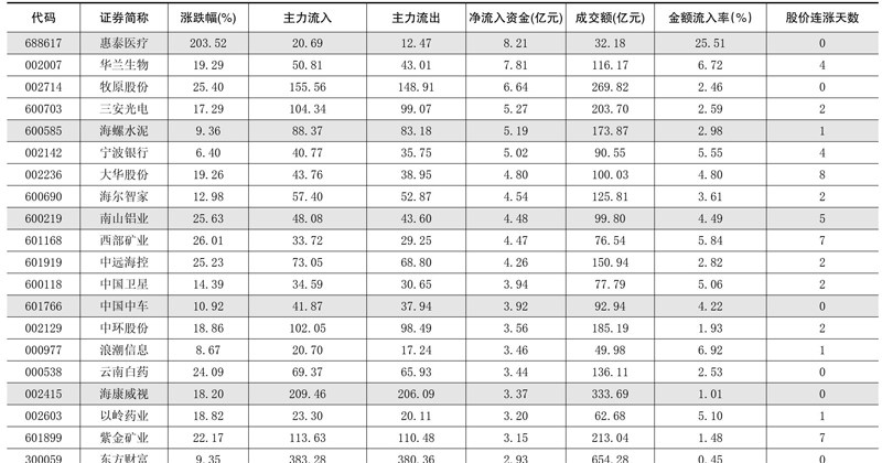 一周主力资金净流入额前20名个股 一周主力资金净流出额前20名个股