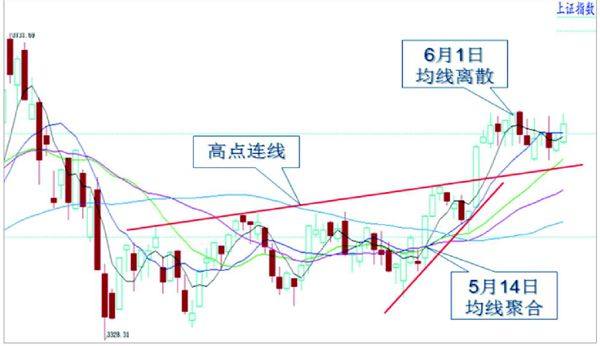大盘指数波浪形态,就像市场先生变的戏法,等到谜底揭开的那一刻,人人都说太简单!而在此之前,却往往百思不得其解。这也许是因为,事先来看,指数浪形的排列组合几乎有无限多种,事后当然是确定的一种,可谓是无限性和唯一性的对立统一。 近期的A股市场,多空力量转换特别频繁,约两周时间里,大盘都处于颠簸震荡中。(见图一) 图一:上证指数日K线技术分析 5月14日,上证指数有四条均线几乎聚合在3450点