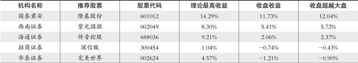 上期荐股排名(2021年5月31日-2021年06月11日) 累计排名 收盘收益=(本期收盘价-上期收盘价)/上期收盘价。 本期累计收益率=(1+上期累计收益率)*(1+本期收益率)-1。 大盘表现:1、当期大盘表现为上证指数两周涨跌:2、累计大盘表现为截止当期末上证指数年内涨跌。 编辑笔记 芯片全球紧张,新能源烽烟再起,把握这两个未来产业大方向。 上周荐股第一名 国泰君安