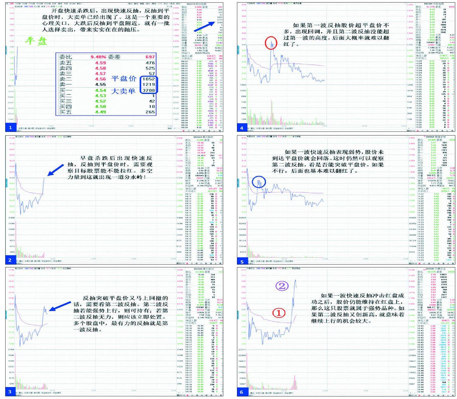 强势股容易在早盘快速杀跌,抛售潮过后,股价震荡一段时间后也容易出现反弹。跌后反弹方式有多种,对于活跃强势股,见得较多的是分时一波快速冲高,然后将股价拉回到红盘之上。 如果你曾认真观察过早盘下跌,股价从绿盘下快速拉高回到红盘盘口,就能发现平盘价是个“神秘价位”。股价反抽时,平盘价非常容易出现大抛压。这种“神秘现象”导致股价较弱,根本冲不过平盘价。一般强势品种冲过平盘价后,也很容易被密集的卖盘砸回。