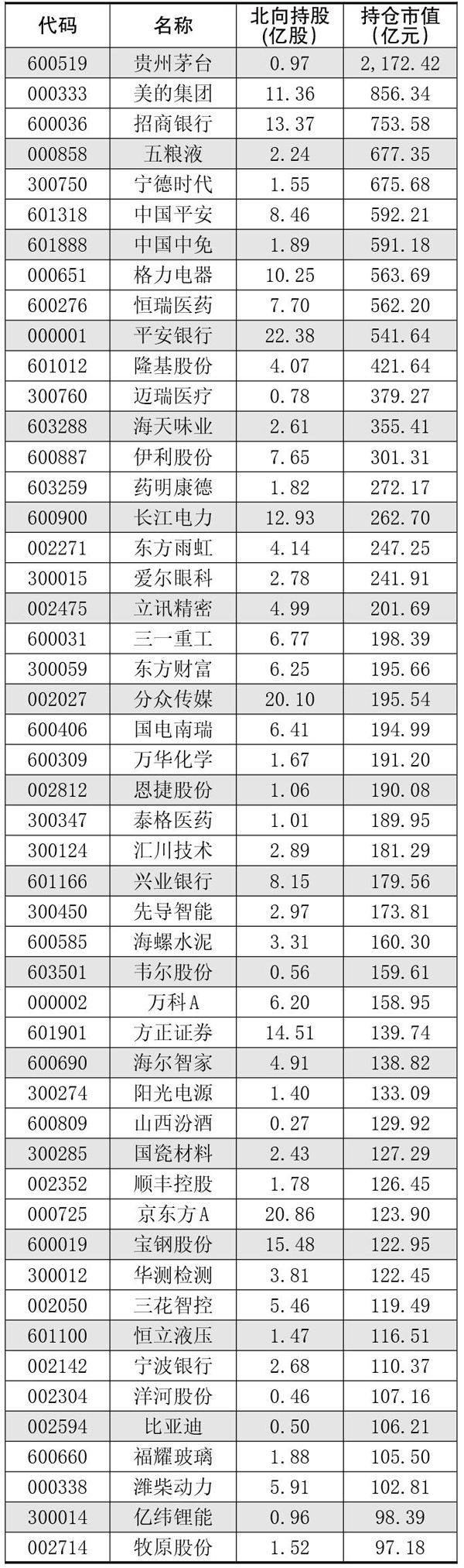 北上资金持仓、持股变动