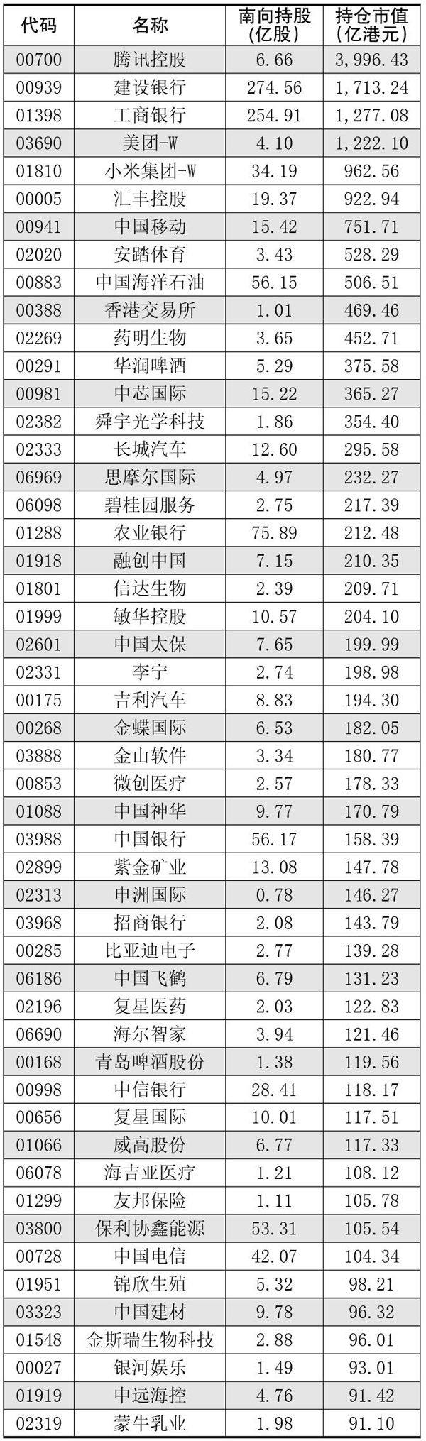 南下资金持仓、持股变动