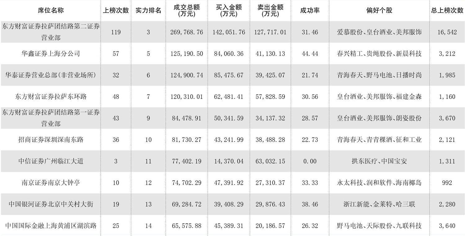 龙虎榜成交额前10名偏好个股 龙虎榜净买入额前10名偏好个股