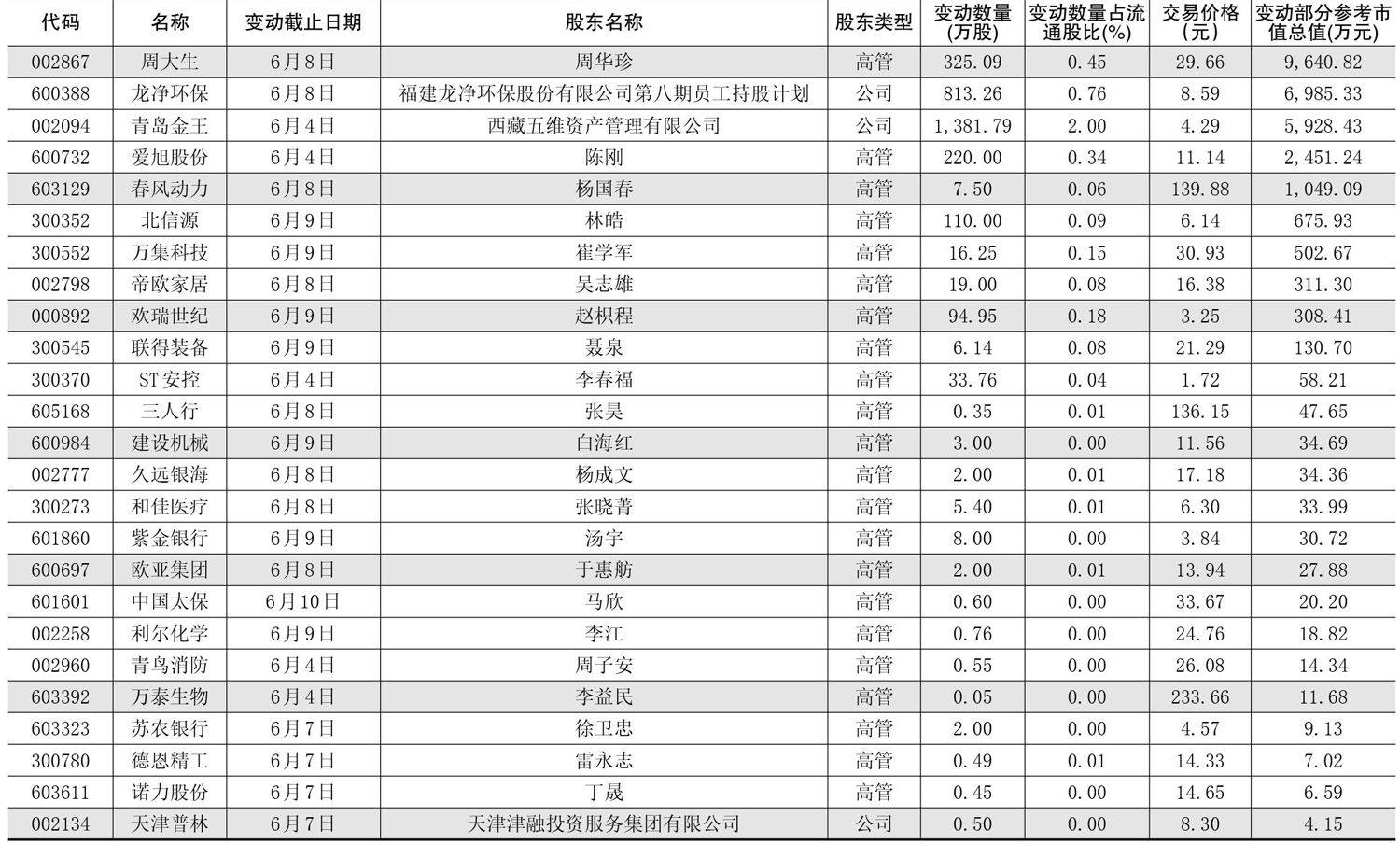 一周重要股东二级市场增持明细 一周重要股东二级市场减持明细