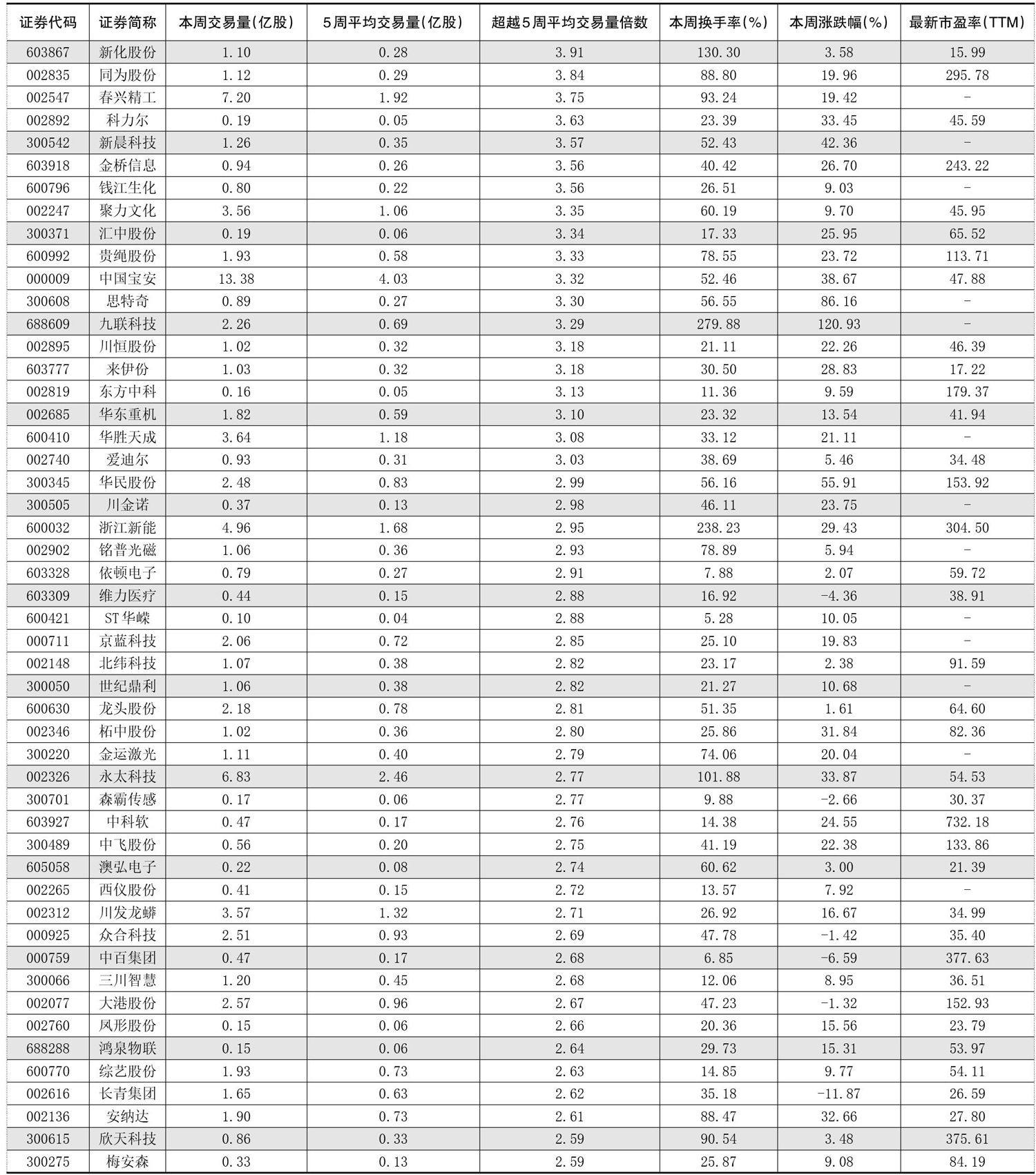 一周成交量大幅增加前50只个股