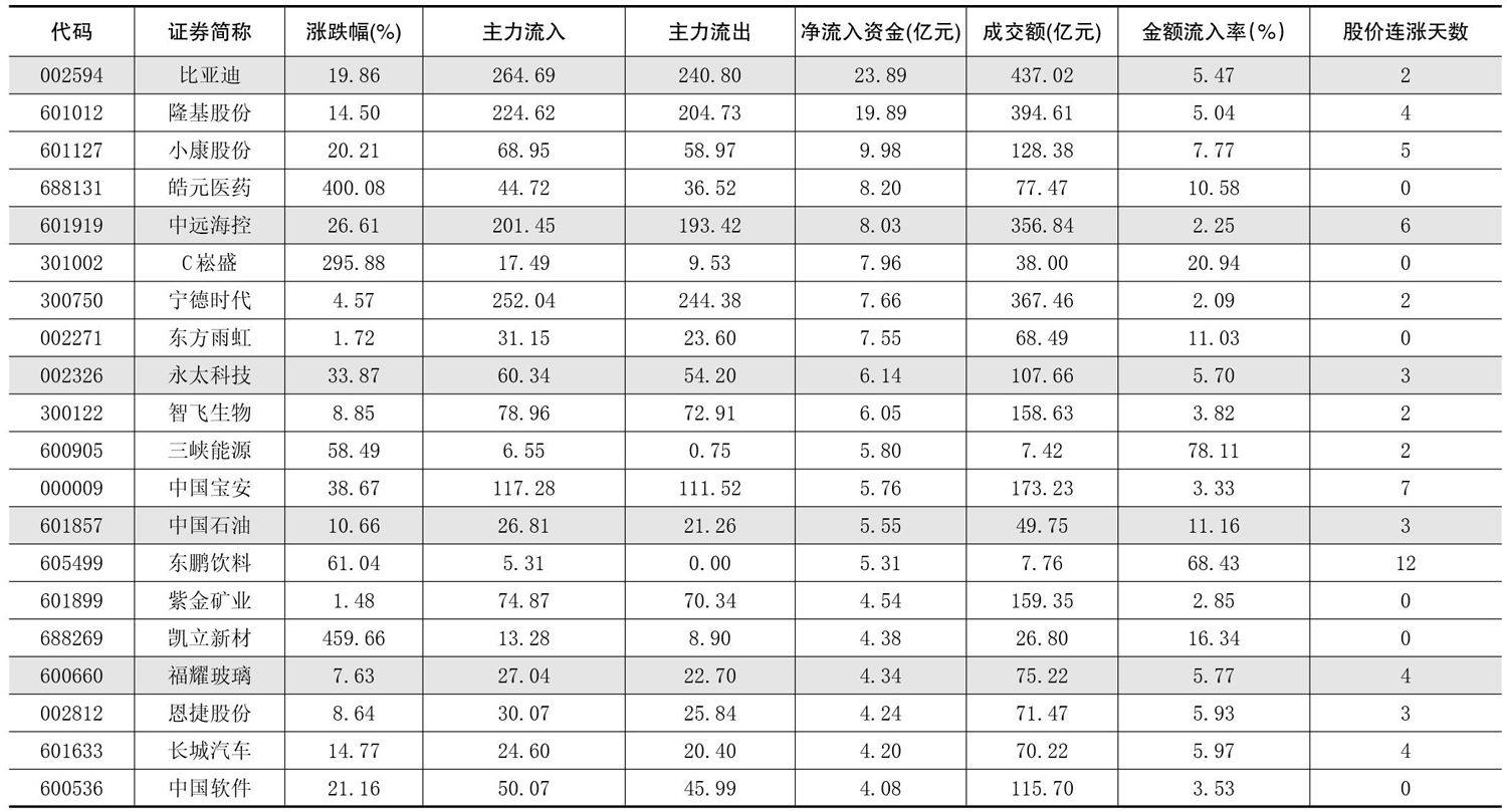 一周资金净流入(出)额前20名