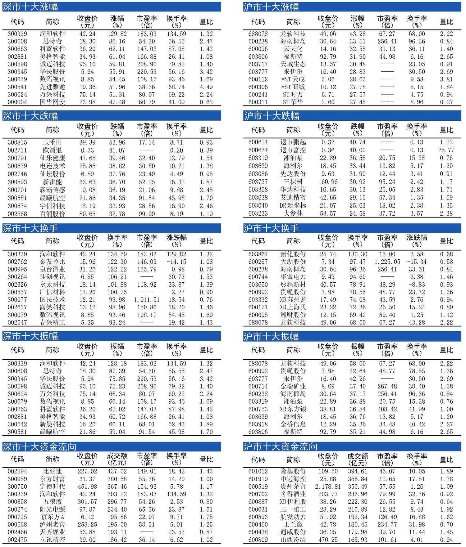 十大涨跌幅、换手、振幅、资金流向