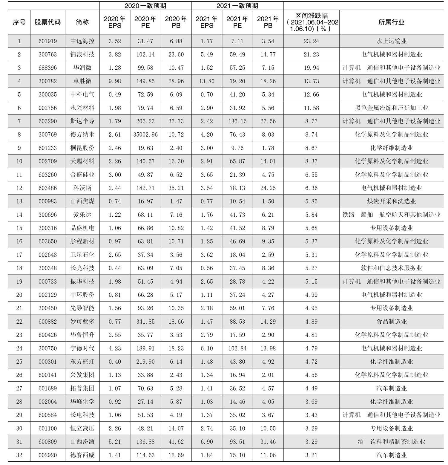 (数据来源:东方财富choice)1、本数据系在近2个月内,调整幅度大于10%、预测机构数大于10家、一致预期不断调高的股票。2、一致预期EPS(每股收益):近3月内,机构影响力和发布时间影响力双重加权计算。