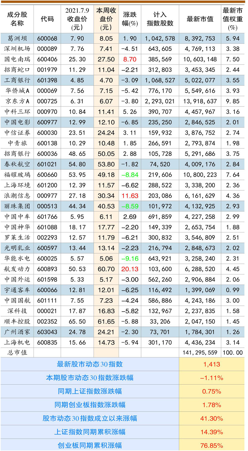 本期股市动态30指数收于1413点,较上期下跌1.11%,同期上证指数上涨0.75%,创业板指上涨1.78%。股市动态30指数成立以来上涨41.3%,同期上证指数上涨14.39%,创业板指上涨76.85%。成分股航发动力、浪潮信息、国电南瑞等个股涨幅靠前,华能水电、福耀玻璃、上海环境等个股跌幅居前。 本期成分股重大事项及评论: 顺丰控股(002352):根据二季度十大重仓股数据显示,截至6月3