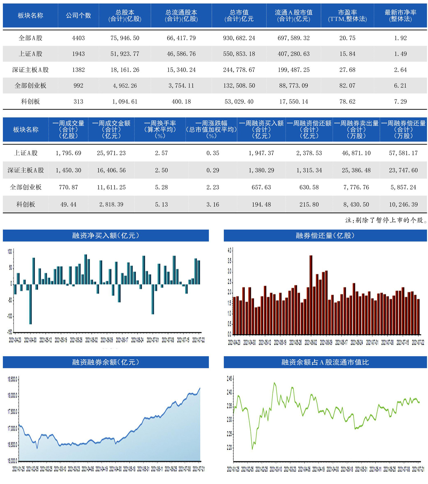 截至7月21日收盘,沪指报3562.66点,涨0.73%;深成指报15212.60点,涨1.34%;创指报3560.05点,涨2.78%。盘面上,盐湖提锂、汽车整车、锂电池等板块涨幅居前,北向资金全天净买入逾30亿元。 大宗交易市场上,7月15日-7月21日5个交易日里沪深两市共发生大宗交易817笔,其中深市成交391笔,沪市成交426笔,合计成交10.37亿股,成交金额为182.64亿元。