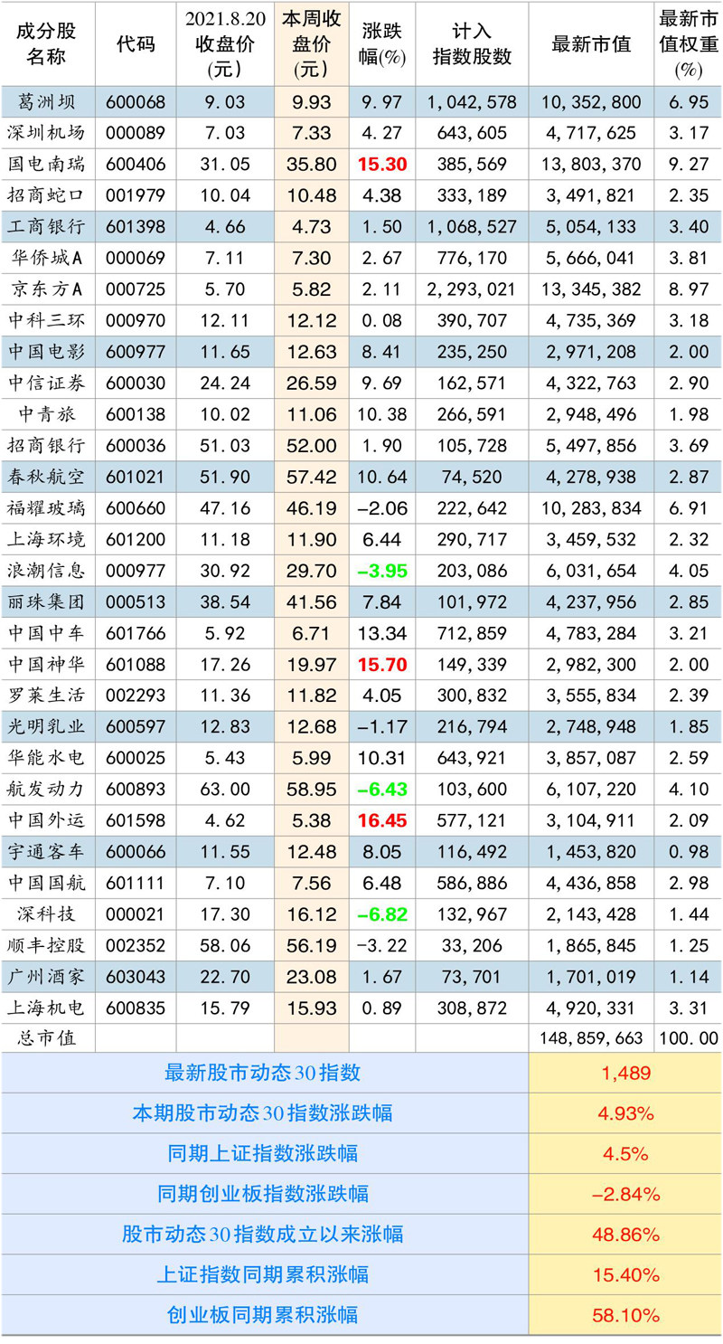 本期股市动态30指数收于1489点,较上期上涨4.93%,同期上证指数上涨4.5%,创业板指数下跌2.84%。成分股中,中国外运、中国神华和国电南瑞等个股涨幅靠前。深科技、航发动力和浪潮信息涨幅靠后 个股点评: 浪潮信息(000977):浪潮近日公布了半年报,上半年实现收入同比减少5.7%至286亿元,其中Q2营收为168亿元,同比下降11.3%,主要是去年疫情期间线上工作增多,下游厂商采购服