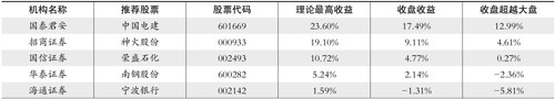 上期荐股排名(2021年08月23日-2021年09月03日 累计排名 收盘收益=(本期收盘价—上期收盘价)/上期收盘价。 本期累计收益率=(1+上期累计收益率)*(1+本期收益率)-1。 大盘表现:1、当期大盘表现为上证指数两周涨跌;2、累计大盘表现为截止当期末上证指数年内涨跌。 编辑笔记 国泰君安收盘收益:17.49% 中国电建(601669):中国电建储能/光伏/电力运