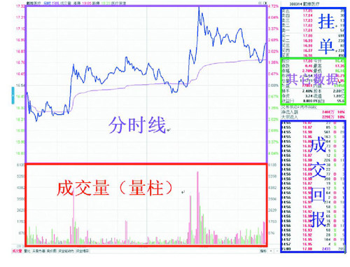 股票市场分析与看盘讲究由大到小。对指数或个股的盘面进行分析属于微观范畴,盘面往下还可分为更小的微观范畴。本文将对盘面往下更小的微观范畴进行分类。 个股盘口的结构与关系 盘面、盘口我们统称分时盘口,个股分时盘口主要由五大块组成,分别为分时线、成交量(量柱)、卖买挂单、成交回报、其它数据(见图一)。这五大块中的每一块又可进一步划分。 图一:盘口五大构成板块 分时线往下结构关系 分时线的结