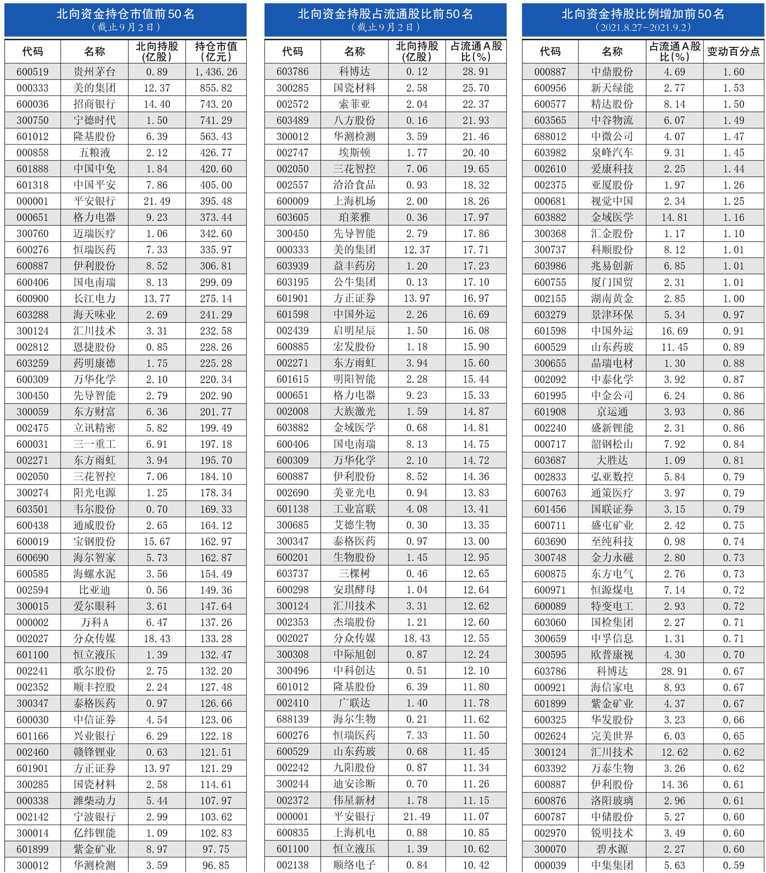 北上资金持仓、持股变动